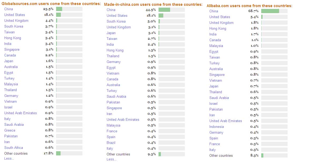 以上这些数据说明的是环球资源(http://www.globalsources.com),焦点科技(http://www.made-in-china.com),阿里巴巴(http://www.alibaba.com)三个平台站点的前25名访问者地区分布和比例情况,说明贴近现实和销售说辞之间的差距,当然我们需要思考的问题是: