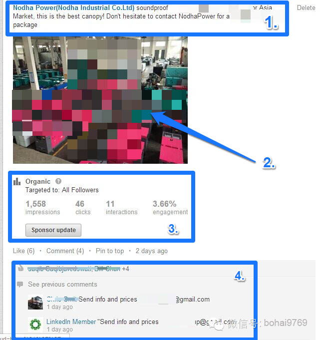 Clicks:顾名思义,即点击了,包括你update中的图片视频或者链接的点击,以及对你LCP的点击(你的Update是出现在对方信息流里面的 LCP会有一个链接)当然LCP的LOGO也是。点击才是真正表明对方感兴趣了,采取了action。恭喜click越多你收到询盘的概率就越大!
