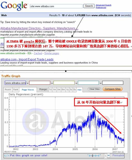 ALIBABA被google降权后,整个网站被GOOGLE收录的网页数量从2006年5月份的1330多万下降到现在的147万,导致网站访问量和推广效果急剧下降的核心原因。